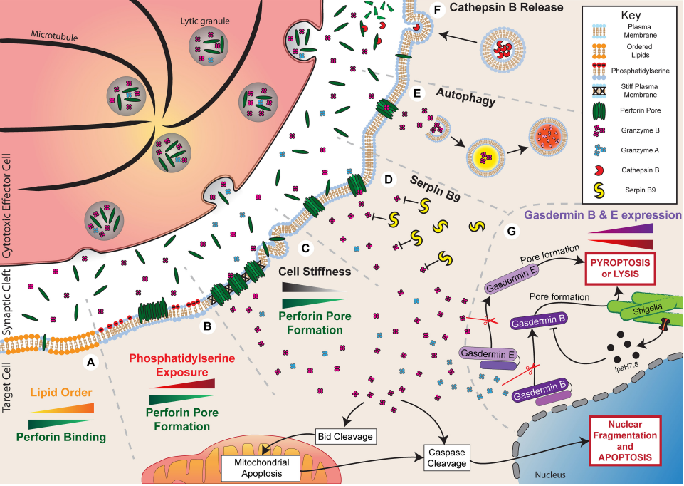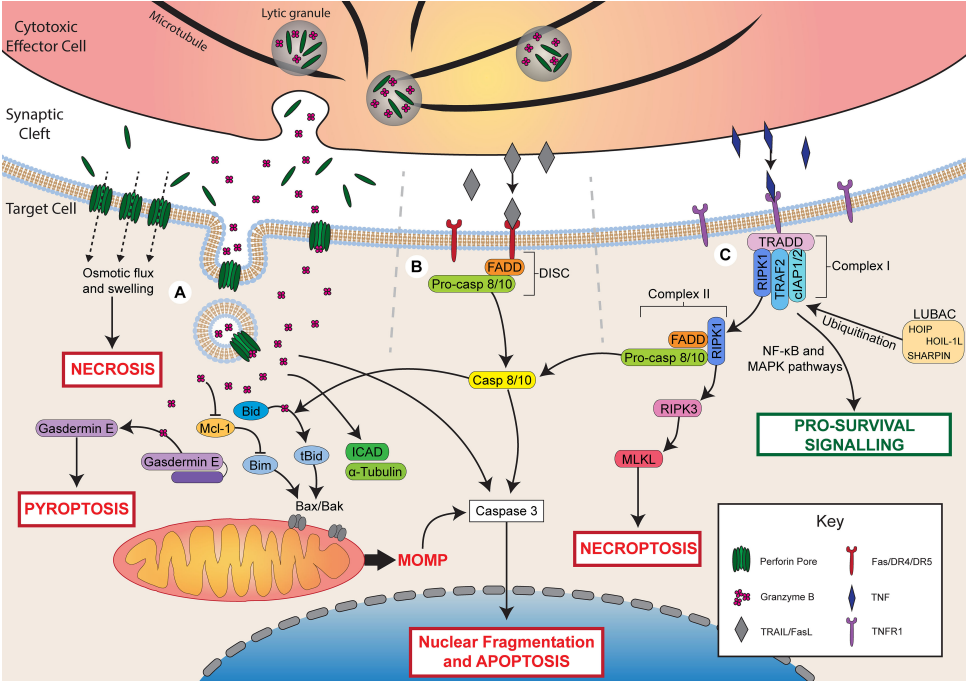 穿孔素和颗粒酶从溶解颗粒中释放到突触间隙。穿孔素在靶细胞膜上形成孔隙。在高浓度的穿孔素下,通过孔的渗透通量导致细胞肿胀和坏死细胞死亡。穿孔素可通过直接扩散或内吞作用促进颗粒酶B的摄取。颗粒酶B通过Bad裂解tbasd直接切割caspase3诱导细胞凋亡或触发线粒体凋亡途径。tBid招募Bax/Bak,导致线粒体外膜通透(MOMP)和细胞凋亡。颗粒酶B也可能降解Mcl-1,释放Bim来激活MOMP。颗粒酶B还可以切割ICAD导致DNA损伤,a-微管蛋白导致细胞骨架降解,或gasderminE,在细胞膜上形成孔,诱导焦亡。
